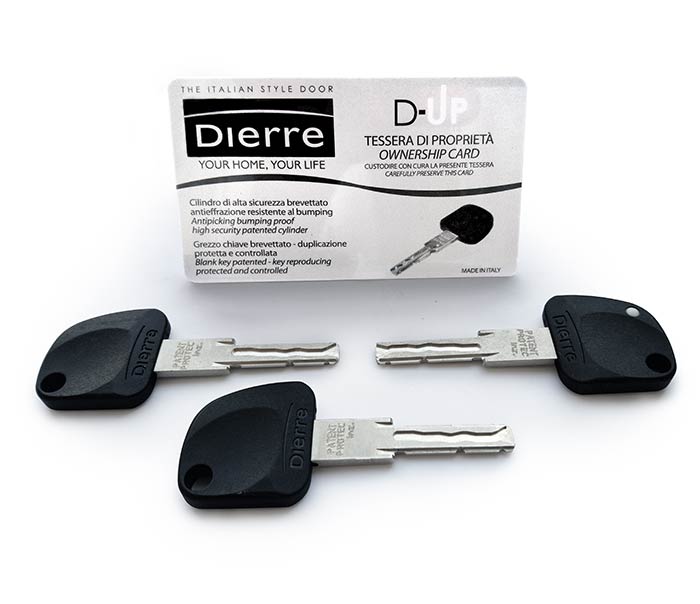 Ключі D-Up захищені від вільного копіювання на найвищому рівні — замовити дублікат можна тільки на заводі в Італії. Замовлення здійснюється при наявності картки власника циліндра. Виготовлення дублікатів на заводі може здатися незручним, але такий підхід практикують майже всі виробники стосовно до своїх топових циліндрів.